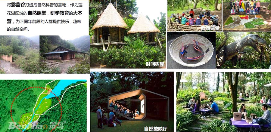 沿線游步道、觀景平臺和露營地蓮花湖片區(qū)的提升設計,及景觀小品、科普設施、休憩設施的配