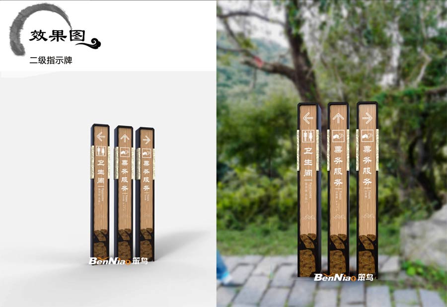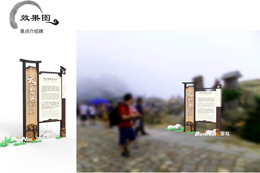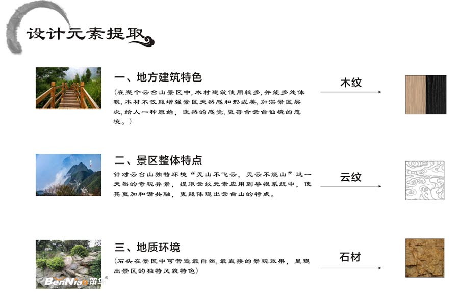 本次海上云臺山導視系統(tǒng)方案,我們將運用木紋,天然石塊,以及一-些自然的環(huán)境特點,來體現(xiàn)云臺山“清幽秀麗、自然靈境、完整生態(tài)”的設計風格,提取元素并轉化為導視系統(tǒng)的一部分,使其與云臺山融為一體,讓標識融入整體的環(huán)境,營造和諧共融。