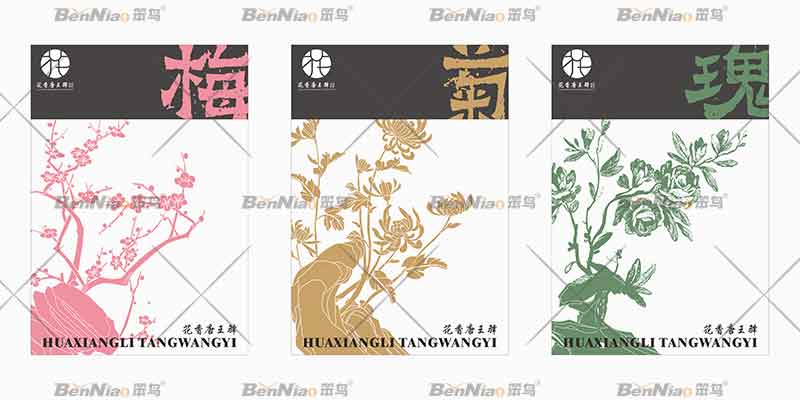 文化成為了旅游的生命,也是景區(qū)的重要吸引力,旅游文化具有極大的發(fā)展?jié)摿Α;ㄏ闾仆躞A景區(qū)的文化元素眾多,在提煉元素的時(shí)候,笨鳥(niǎo)文旅從景區(qū)中最具代表力的花圃進(jìn)行設(shè)計(jì),分別運(yùn)用了花圃中的梅花、菊花、玫瑰等元素繪制出三個(gè)輔助圖形,更直觀地介紹當(dāng)?shù)氐奈幕?。同時(shí)將扁平化的表現(xiàn)形式應(yīng)用在花香唐王驛景區(qū)旅游品牌形象設(shè)計(jì)之中,加上顏色,使得畫(huà)面更有沖擊力。