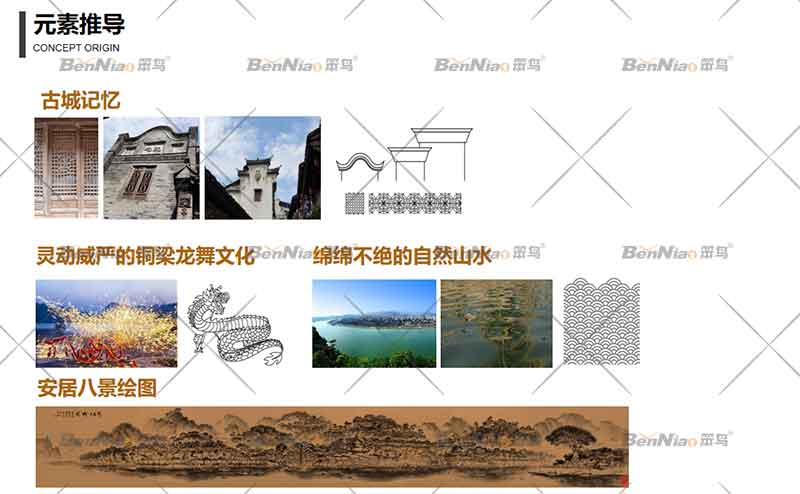 基于自然、歷史、文化、色彩等設(shè)計(jì)理念,我們對(duì)安居古鎮(zhèn)的核心特色進(jìn)行分析,提取相關(guān)視覺元素,形成了自己設(shè)計(jì)思路。