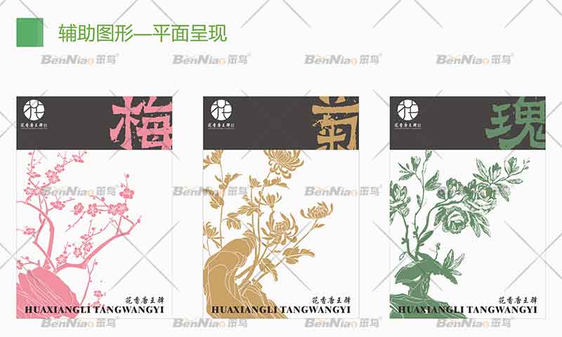 將花圃進(jìn)行提取設(shè)計(jì),分別運(yùn)用了花圃中的梅花、菊花、玫瑰等元素繪制出三個(gè)輔助圖形融入包裝設(shè)計(jì)中,圖形元素提取的圖像可以直觀的表達(dá)商品信息,體現(xiàn)包裝的整體色調(diào),凸顯地區(qū)文化特征,通過包裝設(shè)計(jì)更直觀地了解當(dāng)?shù)氐奈幕?/span> 。