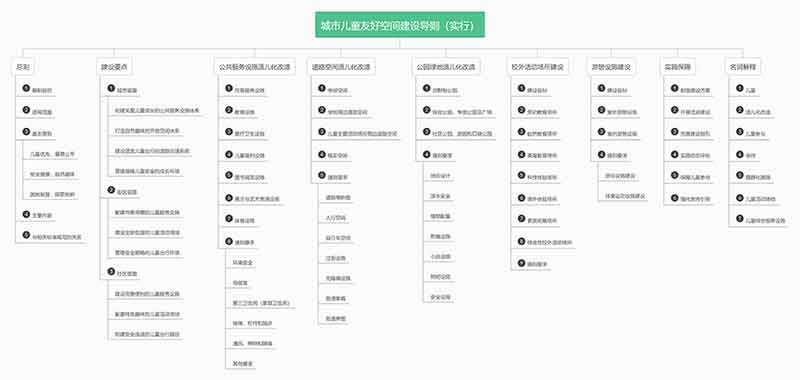 《城市兒童友好空間建設(shè)導(dǎo)則(試行)》總共分為九個(gè)章節(jié),整個(gè)文件從城市、街區(qū)、社區(qū)三個(gè)層面提出建設(shè)要點(diǎn),對(duì)公共服務(wù)設(shè)施、道路空間、公園綠地等兒童常出入空間提出適兒化改造,并對(duì)校外活動(dòng)場(chǎng)所和游憩設(shè)施建設(shè)提出要求,并且配合實(shí)施保障部分,努力推行兒童友好空間建設(shè)。