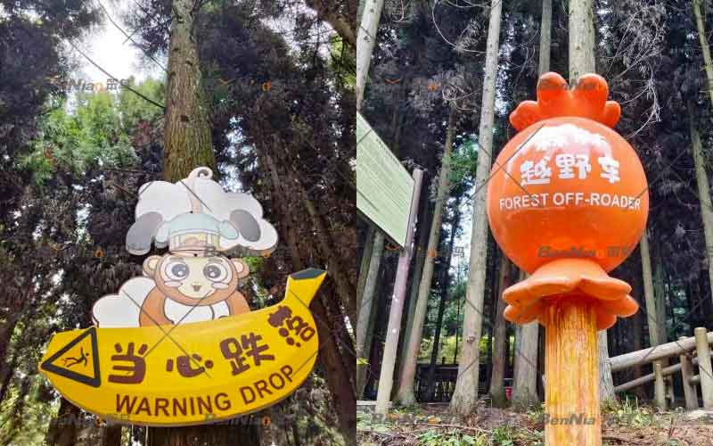 在警示標(biāo)識(shí)以及游樂(lè)項(xiàng)目名稱(chēng)標(biāo)識(shí)上,笨鳥(niǎo)文旅也獨(dú)具創(chuàng)意,既貼合環(huán)境,又進(jìn)行了童趣的表達(dá),符合兒童的期待,也幫助兒童提高游憩體驗(yàn)。
