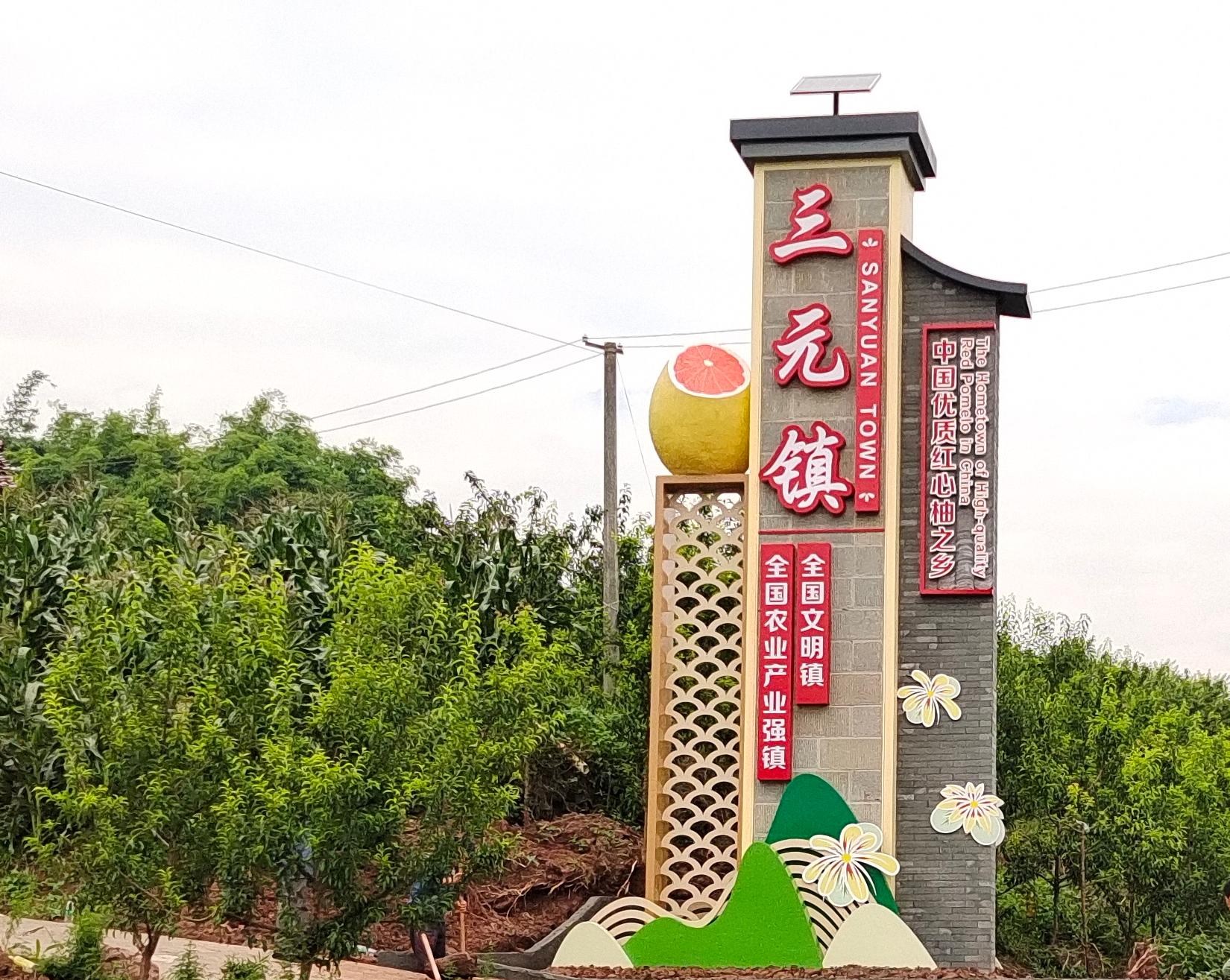 以豐都縣三元鎮(zhèn)為例,笨鳥團隊結(jié)合三元鎮(zhèn)道路交通實際現(xiàn)狀,沿著交通干道規(guī)劃、設(shè)計、制作、安裝了“產(chǎn)業(yè)精神堡壘、產(chǎn)業(yè)信息牌”等設(shè)施。這些設(shè)施采用簡約風(fēng)格,統(tǒng)一主色調(diào)和設(shè)計式樣,與村情、村容、村貌、村景融為一體,不僅為小鎮(zhèn)增添了美麗的風(fēng)景線,還向外來游客展示了三元鎮(zhèn)在現(xiàn)代農(nóng)業(yè)、鄉(xiāng)村旅游等產(chǎn)業(yè)發(fā)展方面的現(xiàn)狀。此外,三元鎮(zhèn)還建設(shè)智慧化紅心柚產(chǎn)業(yè)園,打造以三元鎮(zhèn)為中心的紅心柚產(chǎn)業(yè)示范帶,探索紅心柚產(chǎn)銷園綜合體,讓更多游客走進三元鎮(zhèn),品嘗紅心柚,體驗鄉(xiāng)村文化,實現(xiàn)鄉(xiāng)村振興的美好愿景 。