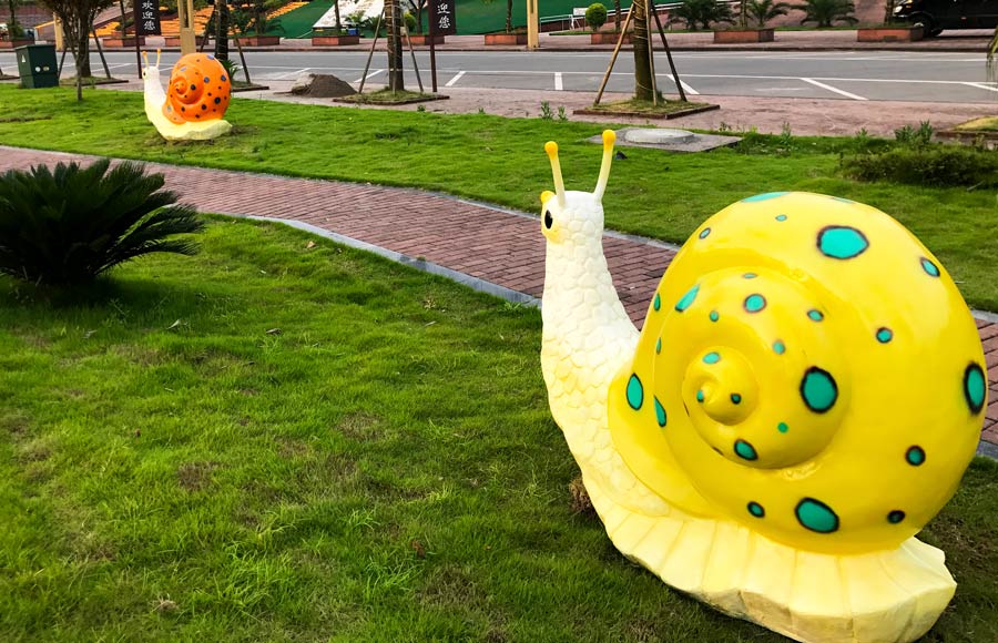 小品以蝸牛造型為載體,蝸牛雖然沒有矯健的身姿,但其不懈努力、執(zhí)著爬行的精神讓人敬佩,用黃、紫、橙展現(xiàn)出蝸牛的活潑可愛,整個(gè)雕塑充滿歡樂。立體化地展現(xiàn)了赤水河旅游景區(qū)生命脈絡(luò),充滿正能量。
