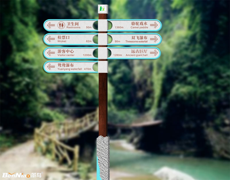 3、單柱式:該類旅游景區(qū)標(biāo)識(shí)的構(gòu)造簡(jiǎn)單,設(shè)定場(chǎng)地一般挑選狹小的旅途,它一般設(shè)定在2個(gè)或好幾個(gè)空間彼此之間轉(zhuǎn)換或交叉的本地。一般做為交通出行導(dǎo)向性標(biāo)識(shí)牌來(lái)應(yīng)用,柱頭上能夠一起設(shè)定總數(shù)較多的標(biāo)識(shí)牌,傳遞很多的標(biāo)示信息和相對(duì)應(yīng)的標(biāo)示方位,那樣就能讓游客在沒(méi)有了解的空間中迅速,很快地得到信息。