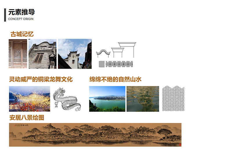 我們以安居古城千年文化積淀和歷史傳承最具代表性的承載物為主要文化展示意向,九宮十八廟、科甲坊、曾氏宗祠、瓊江書院、銅梁龍燈展廳等,將廟宇文化、才子文化、龍文化、市井文化和抗戰(zhàn)文化進(jìn)行有機(jī)融合。