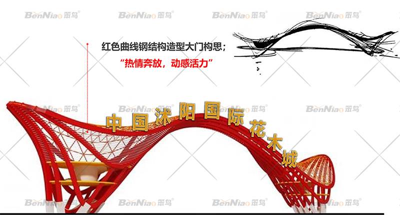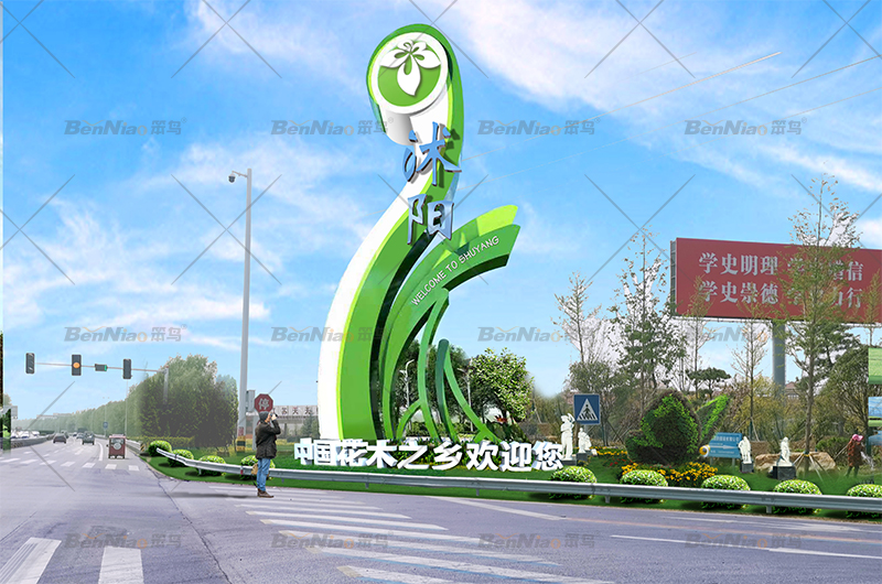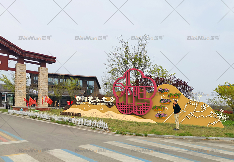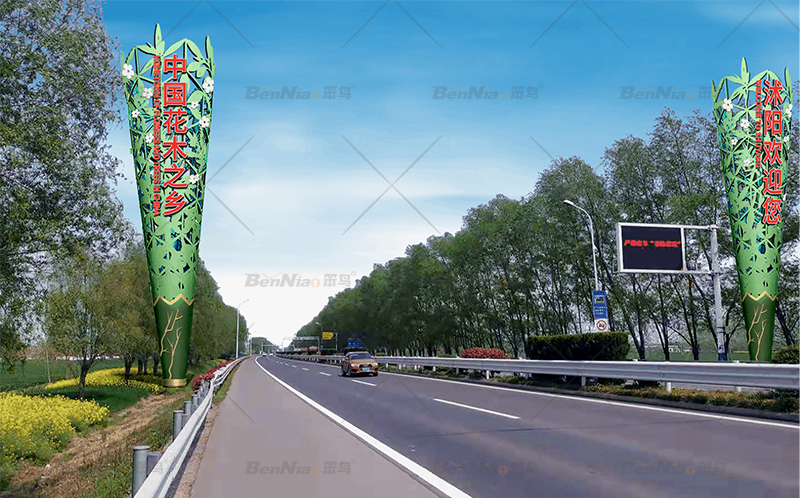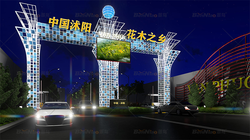 在不同的節(jié)點(diǎn),笨鳥文旅提出了不同的設(shè)計(jì)愿景,豐富整體縣域空間,如為入口形象提出了“花木之鄉(xiāng) 花舞木源”的設(shè)計(jì)愿景,打造花木之鄉(xiāng)入口門戶,突出沭陽縣“中國(guó)花木之鄉(xiāng)”的品牌形象,并展現(xiàn)了入口形象白天和夜間的設(shè)計(jì)效果圖。