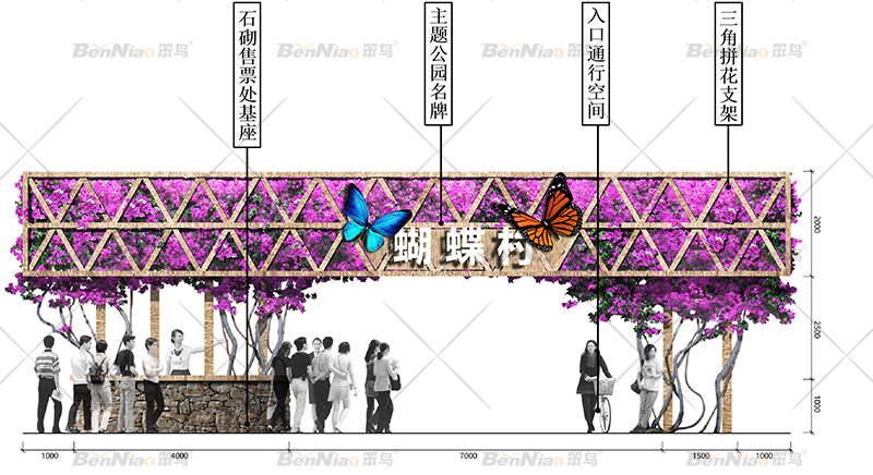 隴集鎮(zhèn)則以彩色為主題,為其提出以“彩色苗木產(chǎn)業(yè)為基礎(chǔ)、彩色道路景觀為框架、彩色集鎮(zhèn)街區(qū)為特色、彩色文化元素為內(nèi)涵”的設(shè)計(jì)愿景,并且進(jìn)行了蝴蝶村主入口門頭、蝴蝶村景觀、小火車驛站、隴集木屋等設(shè)計(jì)。