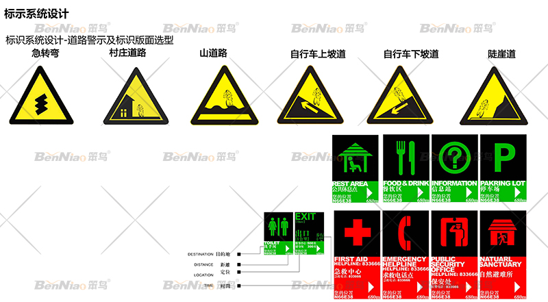 旅游廊道建設(shè)中,不止要打造景觀,提升其吸引力,彰顯地區(qū)主題,基礎(chǔ)公共服務(wù)設(shè)施也是其重點(diǎn)組成部分。在對(duì)旅游廊道進(jìn)行整體景觀提升的同時(shí),笨鳥文旅也針對(duì)自身的拿手業(yè)務(wù)——導(dǎo)視系統(tǒng)規(guī)劃設(shè)計(jì)提出了設(shè)計(jì)規(guī)范,完善旅游廊道的公共服務(wù)設(shè)施。