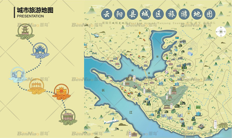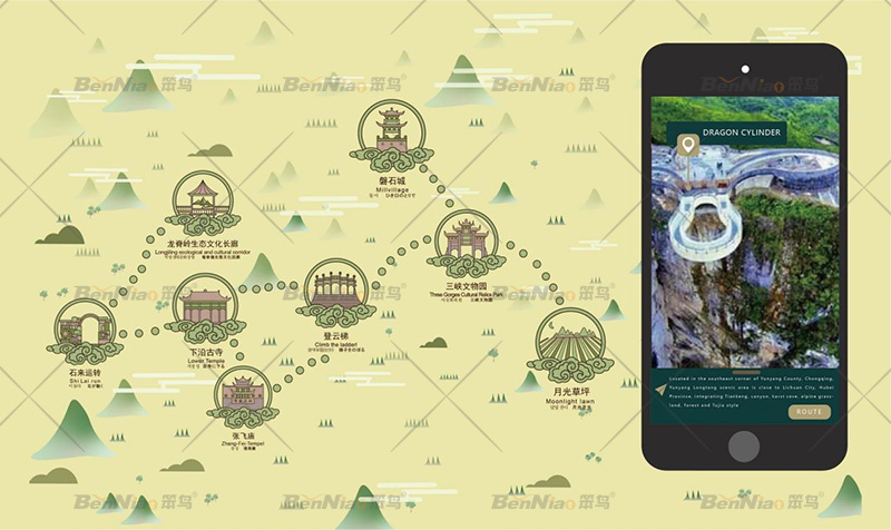 將手繪地圖運(yùn)用在導(dǎo)視系統(tǒng)中,景區(qū)完整呈現(xiàn)在游客面前,讓游客對(duì)云陽(yáng)縣景區(qū)全貌一覽便知,極大的方便了游客對(duì)于參觀(guān)路線(xiàn)的選擇,了解整座城市的旅游景點(diǎn),人文歷史,為推動(dòng)云陽(yáng)縣旅游發(fā)展奠定基礎(chǔ)。