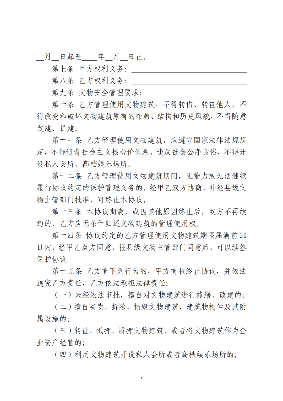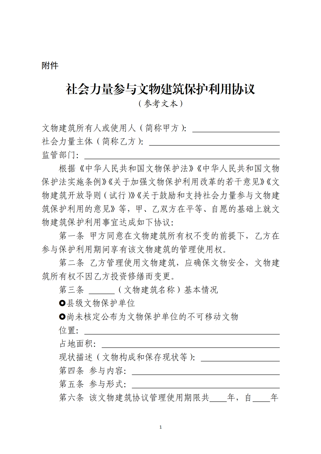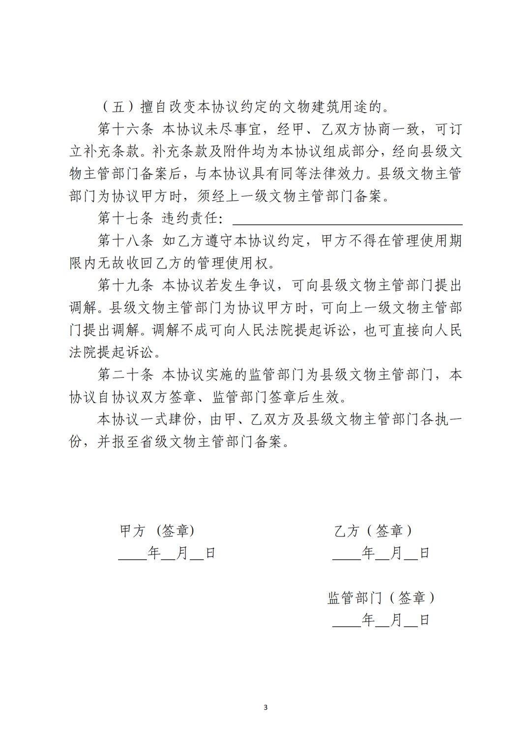 省級文物主管部門可參照社會(huì)力量參與文物建筑保護(hù)利用協(xié)議參考文本(附后),結(jié)合本地實(shí)際,制定社會(huì)力量參與文物建筑保護(hù)利用協(xié)議文本。按照“一處一策”原則,文物建筑所有人或使用人與確定的社會(huì)力量主體簽訂保護(hù)利用協(xié)議,明確保護(hù)利用要求、各方權(quán)利義務(wù)和違約責(zé)任等內(nèi)容。沒有明確使用人的國有文物建筑可由縣級文物主管部門與社會(huì)力量主體簽訂保護(hù)利用協(xié)議。協(xié)議簽訂后,應(yīng)報(bào)至省級文物主管部門備案。