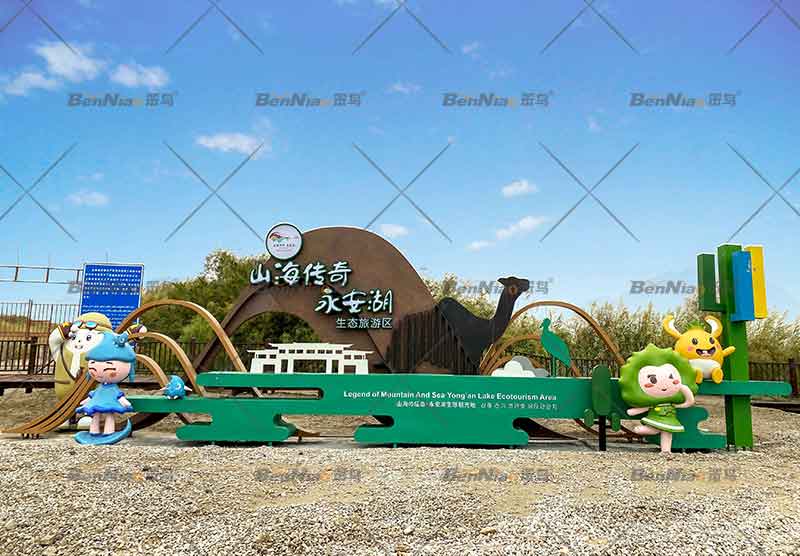 形象標(biāo)識(shí):整個(gè)入口形象運(yùn)用綠色和褐色為主要顏色,體現(xiàn)景區(qū)的自然生態(tài)特色,利用山體的弧線作為主要邊界背景,使入口形象同時(shí)具備大氣和靈動(dòng)的特點(diǎn),搭配各元素之間的鏤空裝飾,使其與環(huán)境相得益彰。