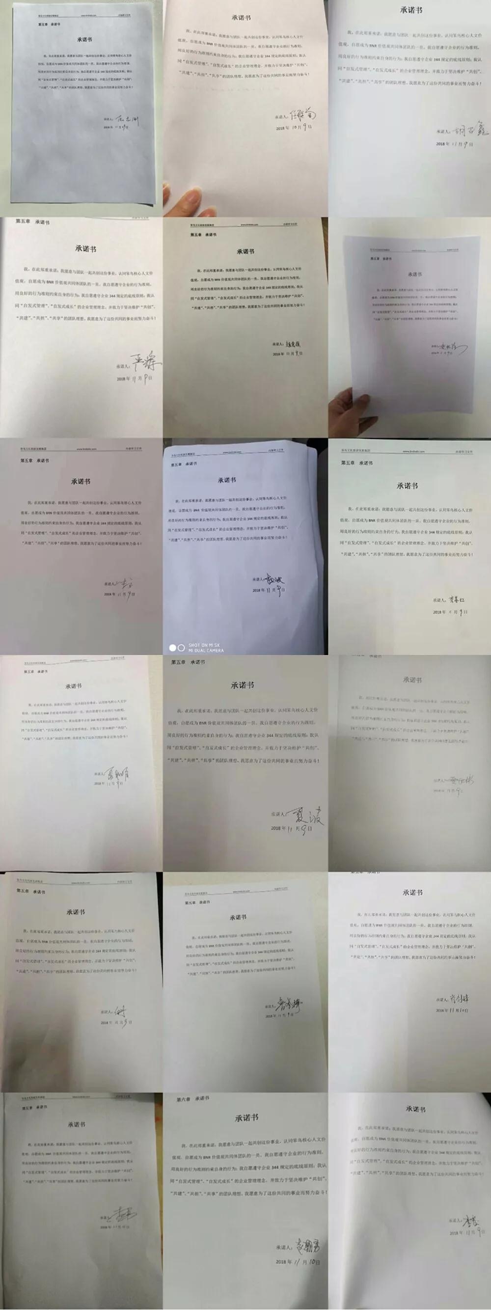 重慶總部辦公室、北京團(tuán)隊(duì)、公司廠(chǎng)部所有員工都自愿簽訂承諾書(shū),愿意與團(tuán)隊(duì)一起共創(chuàng)這份事業(yè),認(rèn)同笨鳥(niǎo)核心人文價(jià)值觀,自愿成為BNR價(jià)值觀共同體團(tuán)隊(duì)的一員。自愿遵守企業(yè)的行為準(zhǔn)則,用良好的行為準(zhǔn)則約束自身的行為;自愿遵守企業(yè)344規(guī)定的底線(xiàn)原則;我認(rèn)同“自發(fā)式管理”、“自發(fā)式成長(zhǎng)”的企業(yè)管理理念,并致力于堅(jiān)決維護(hù)“共創(chuàng)”、“共建”、“共擔(dān)”、“共享”的團(tuán)隊(duì)理想。為了這份共同的事業(yè)而努力奮斗!