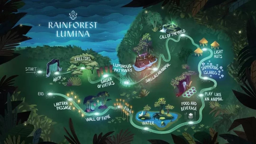 新加坡動物園"幻光雨林之夜”的夜游行程全長一公里,分為11個區(qū)域,多個觀眾體驗項目。夜間展覽中,動物們都已經(jīng)回到宿舍睡覺,既不會影響動物休息,發(fā)光技術(shù)也不會影響植物的正常生長。在這段一公里的蜿蜒步道上,星光閃爍、音樂悠揚,在魔幻光影中有神秘的幻光動物帶領(lǐng)您一起探索雨林傳說,讓游客感受自然環(huán)境和現(xiàn)代科技賦予的奇妙體驗。